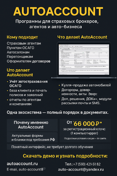 • Возможность интеграции с программой "Учёт автострахования ОСАГО"